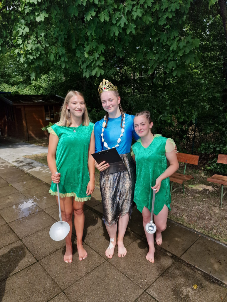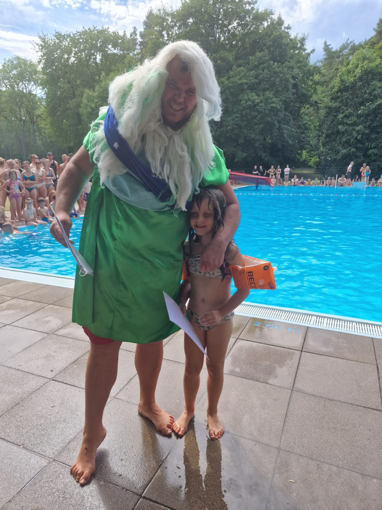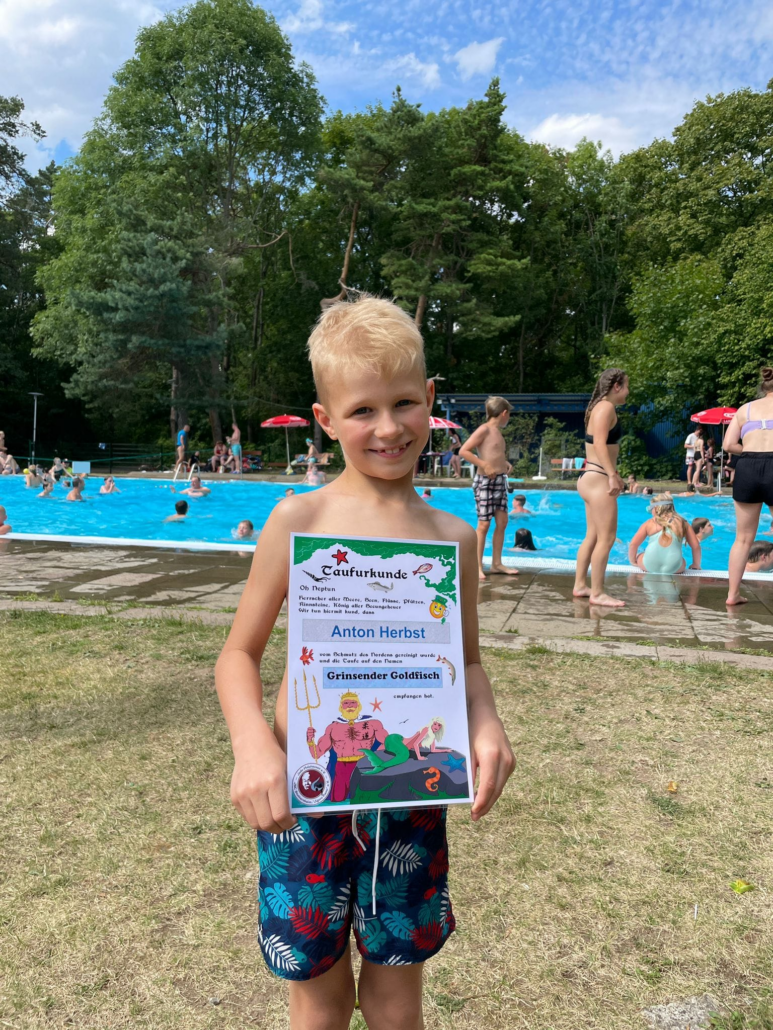 Am Nachmittag stand ein weiteres Highlight an: „Die Neptun-Taufe”. Anton Herbst (7 Jahre) war einer der Neptun-Sprösslinge. Als Anton aufgerufen wurde, gab es einen fehlgeschlagen Fluchtversuch, denn er wurde von einem der Häscher gefangen und zu Neptun gebracht. Hier musste er einige Prüfungen über sich ergehen lassen, die er aber mit Bravour bestand und wurde somit auf den Namen „Grinsender Goldfisch“ getauft.