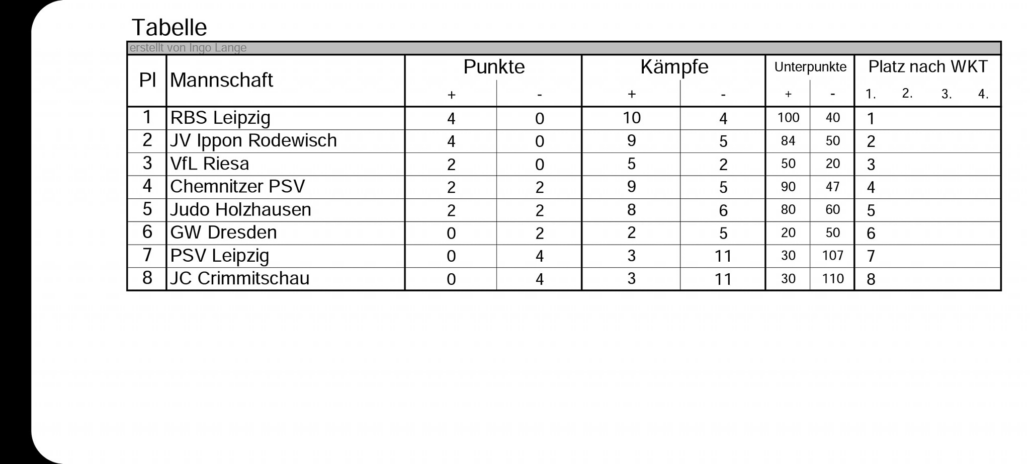 Gegen die erfahrenen Männer von RBS Leipzig mussten unsere Männer eine 2:5 Niederlage hinnehmen. Hier merkte man die langjährige Erfahrung der gegnerischen Mannschaft, die 2019 auch Sieger in der Verbandsliga wurde. Unsere Jungs zeigten sich trotzdem von einer guten Seite und insbesondere die Kämpfe von Jannek und Tommy verliefen sehr knapp.